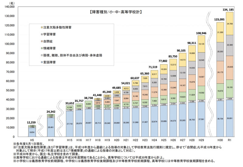 少子化の一方で、障害を抱える子どもの数は年々増えています(グラフ:文部科学省「特別教育支援資料(令和元年度)」)。子どもが0歳で入園したときは、その子に障害があるかどうかはわかりませんが、3歳児検診の頃から周囲の子と比べて発達に気になる部分が見られてくる子が出てきます。このように、子どもによって発達段階が異なってくる中で、1つのクラスを運営していくには、1人ひとりの子どもの発達の特性を見極める必要があることから、ベテラン保育士でも、手探りで模索しながら保育をしているという現実があります。